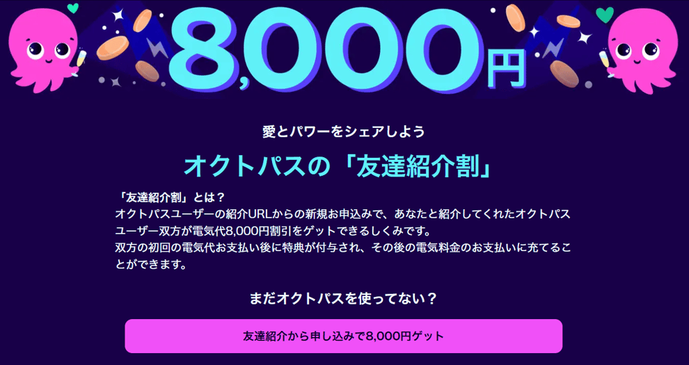電気代節約にどうぞ!オクトパスエナジーの「お友達紹介割」が8,000円にUP